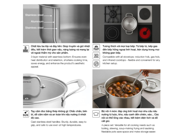 Điểm nhấn nổi bật của bộ nồi chảo này nằm ở cấu tạo chất liệu ba lớp với đáy liền. Lớp cấu tạo này không chỉ đảm bảo sự bền bỉ, chắc chắn mà còn mang lại khả năng truyền và giữ nhiệt cực kỳ hiệu quả. Điều này có nghĩa là nhiệt lượng sẽ được phân bổ đều khắp bề mặt nồi và chảo, giúp thức ăn chín đều, tránh tình trạng cháy cục bộ hay chín không đều. Việc truyền nhiệt tối ưu còn giúp rút ngắn thời gian nấu nướng, từ đó tiết kiệm đáng kể năng lượng tiêu thụ và giảm chi phí điện, gas cho gia đình. Hơn nữa, bề mặt bóng bẩy, sáng mịn của chất liệu cao cấp còn góp phần tạo nên vẻ ngoài sang trọng, hiện đại cho không gian bếp.