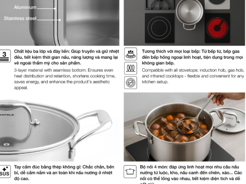 Bộ nồi chảo Hafele 535.44.167 không chỉ chú trọng vào hiệu suất nấu nướng mà còn mang đến nhiều tiện ích giúp nâng cao trải nghiệm người dùng:
