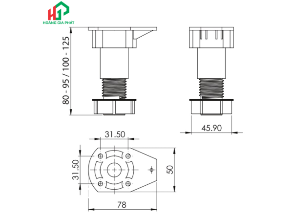 Khả năng điều chỉnh chiều cao 80 - 95mm giúp việc lắp đặt trở nên dễ dàng trên mọi địa hình, đồng thời tối ưu hóa công năng sử dụng.