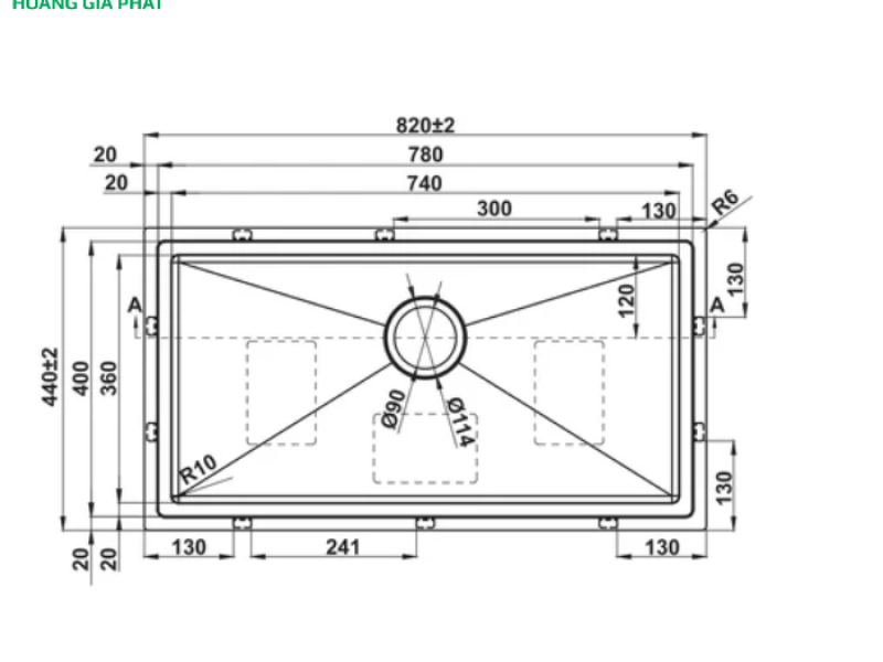 Hộc chậu có kích thước 740 x 360 x 220 mm cung cấp dung tích lớn, lý tưởng để rửa các vật dụng có kích thước cồng kềnh như nồi áp suất, khay nướng, hay nhiều bát đĩa cùng lúc. Chiều sâu 220mm cũng giúp hạn chế tình trạng nước bắn ra ngoài trong quá trình sử dụng.