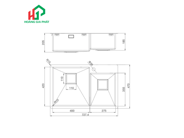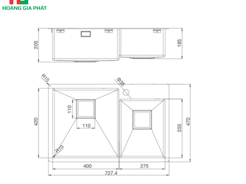 Điểm nhấn đầu tiên và nổi bật nhất của Chậu rửa chén 2 hố MALLOCA MS 620T chính là thiết kế hai hố rửa. Với chiều dài tổng thể lên đến 72.7 cm, chậu được chia thành hai ngăn với kích thước khác nhau: một hố lớn và một hố nhỏ. Sự phân chia này mang lại sự tiện lợi vượt trội, cho phép người dùng thực hiện đồng thời nhiều công việc trong bếp.