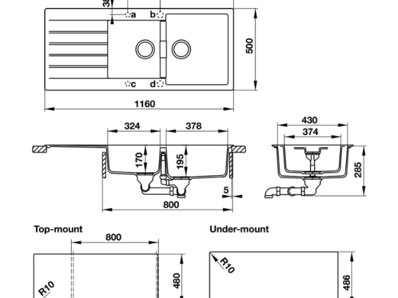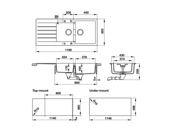 Lắp âm: Lắp âm mang lại vẻ ngoài liền mạch và tinh tế hơn, khi phần viền chậu được giấu dưới mặt bàn bếp. Phương pháp này yêu cầu kỹ thuật lắp đặt cao hơn nhưng tạo hiệu quả thẩm mỹ vượt trội. Kích thước cắt đá cho lắp âm là D1146 x R486mm.
