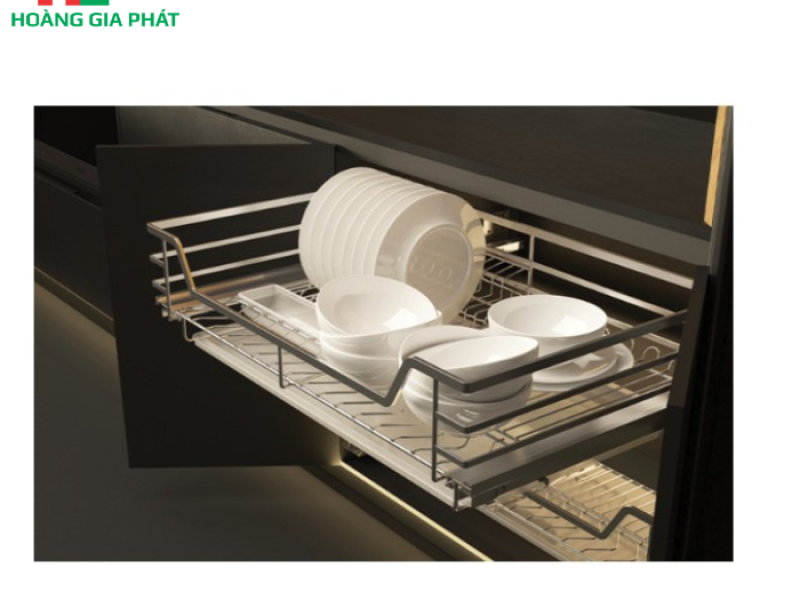 Đây là vị trí lắp đặt phổ biến nhất cho các loại rổ bát đĩa. Với chiều rộng 700mm, rổ này lý tưởng cho các khoang tủ bếp có kích thước tương đương. Việc lắp đặt trên hệ thống ray trượt giúp bạn dễ dàng tiếp cận bát đĩa mà không cần phải cúi gập người, giảm thiểu nguy cơ đau lưng và mang lại trải nghiệm sử dụng tiện lợi hơn.