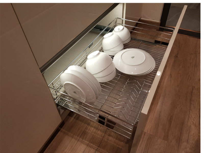 Cấu trúc 3 sides (3 cạnh) của rổ giúp giữ cho bát đĩa, ly tách luôn được cố định, tránh xê dịch hay va chạm vào nhau trong quá trình đóng mở tủ. Các khe hở được thiết kế hợp lý, vừa đảm bảo sự thông thoáng, giúp chén đĩa nhanh khô ráo, hạn chế vi khuẩn phát triển, vừa phân chia không gian khoa học để bạn dễ dàng sắp xếp các loại vật dụng khác nhau như tô, chén, đĩa, ly, muỗng, đũa. Thiết kế này không chỉ tối ưu hóa không gian lưu trữ mà còn giúp việc sắp xếp và lấy đồ trở nên nhanh chóng và tiện lợi hơn.