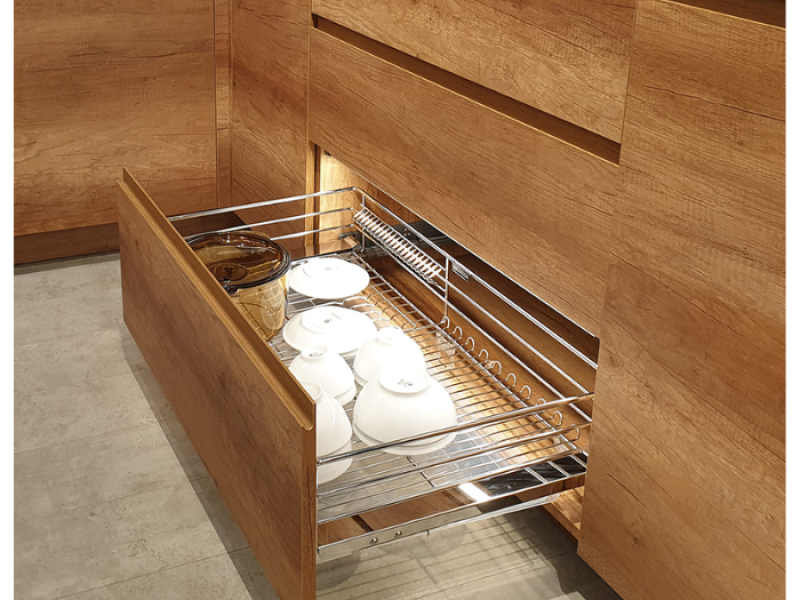 Với hệ thống ray trượt âm giảm chấn, việc sử dụng rổ trở nên cực kỳ êm ái và tiện lợi. Bạn có thể dễ dàng kéo rổ ra để lấy đồ và đẩy vào nhẹ nhàng mà không gây tiếng động khó chịu hay làm rung lắc các vật dụng khác. Trải nghiệm nấu nướng sẽ trở nên thú vị và thoải mái hơn rất nhiều.