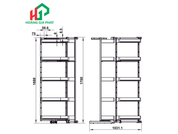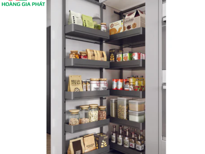 Để lắp đặt hệ thống này, yêu cầu tối thiểu về chiều cao tủ là 1700 mm và chiều sâu tủ là 500 mm. Đây là những kích thước khá phổ biến trong thiết kế tủ bếp, giúp việc tích hợp trở nên dễ dàng. Về khả năng chịu tải, các khay lớn có thể chứa tới 10 kg và khay nhỏ là 4 kg, đủ sức đáp ứng nhu cầu lưu trữ đa dạng của gia đình, từ thực phẩm khô đến các vật dụng nhà bếp.