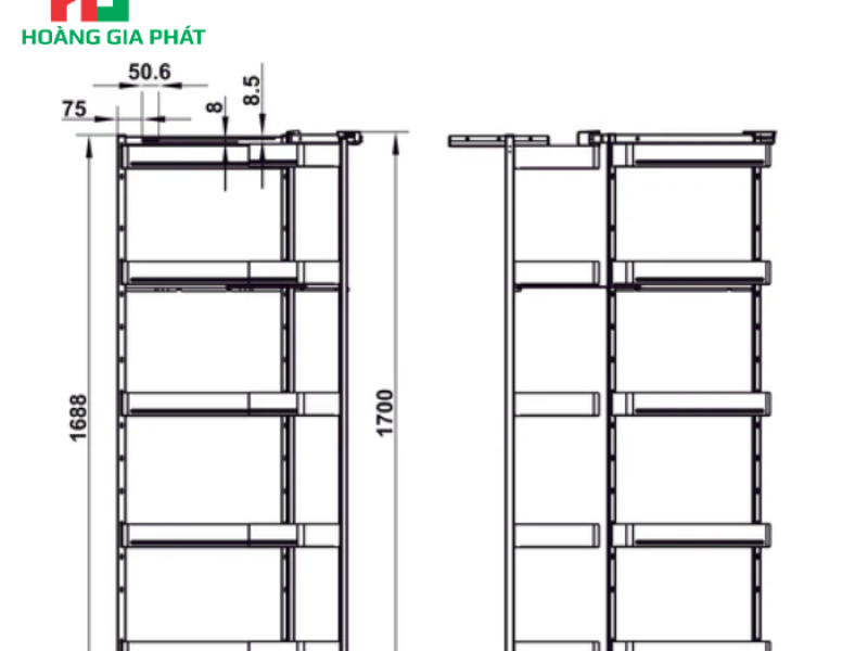 Với các kích thước như 650 mm, ≥ 562mm, và bộ khung có kích thước tổng thể 555 x 482 x 1700 mm, hệ thống này mang đến sự linh hoạt cao trong việc lắp đặt. Đặc biệt, khả năng điều chỉnh khoảng cách giữa các khay là một điểm cộng lớn. Bộ khung được thiết kế với nhiều vị trí treo khay, cho phép người dùng tùy chỉnh khoảng cách giữa các tầng một cách linh hoạt. Điều này không chỉ phù hợp với chiều cao đa dạng của các vật dụng cần lưu trữ mà còn tối ưu hóa không gian bên trong tủ.