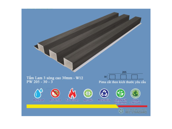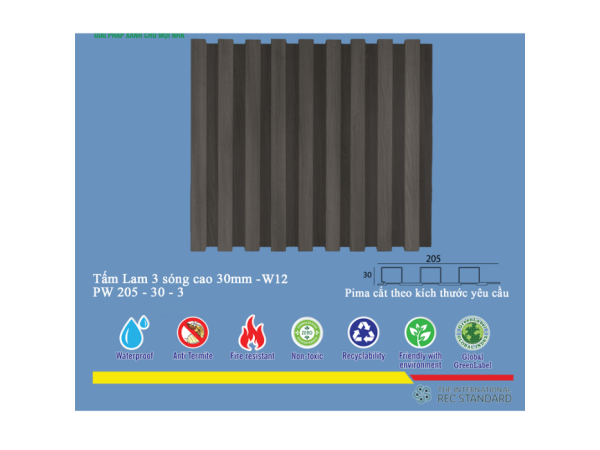 Tấm Lam 3 Sóng Pima 30 phủ vân gỗ W12 là một sản phẩm vật liệu ốp tường, trang trí nội thất cao cấp, được thiết kế với cấu trúc 3 sóng độc đáo, tạo hiệu ứng thị giác ấn tượng và chiều sâu cho không gian. Sản phẩm sử dụng công nghệ phủ vân gỗ hiện đại, mô phỏng chân thực vẻ đẹp tự nhiên của các loại gỗ quý, mang đến sự ấm cúng, sang trọng và gần gũi. Với mã W12, sản phẩm này thể hiện một gam màu vân gỗ đặc trưng, phù hợp với nhiều phong cách thiết kế nội thất khác nhau. Kích thước tiêu chuẩn của tấm lam này thường dao động với chiều dài từ 3000 – 3600 mm, chiều rộng 205 mm và độ dày 30mm, tạo sự linh hoạt trong quá trình ứng dụng.