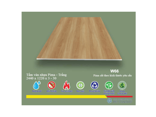 Cấu tạo của tấm Pima 15mm phủ HPL W66 bao gồm hai thành phần chính: cốt liệu và lớp phủ HPL. Cốt liệu thường được làm từ nhựa PVC cao cấp, có khả năng chống ẩm, chống mối mọt và chịu lực tốt. Lớp phủ HPL là một loại vật liệu bề mặt được tạo ra bằng cách ép nhiều lớp giấy (giấy trang trí, giấy nền) ngâm tẩm nhựa phenolic dưới áp suất và nhiệt độ cao. Quá trình này tạo ra một bề mặt cực kỳ cứng, bền, chống trầy xước, chống thấm nước và dễ dàng vệ sinh. Đặc biệt, với mã W66, bề mặt HPL được thiết kế với họa tiết vân gỗ tinh xảo, mô phỏng chân thực vẻ đẹp tự nhiên, mang lại cảm giác ấm cúng và sang trọng cho không gian.