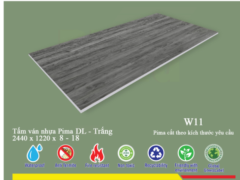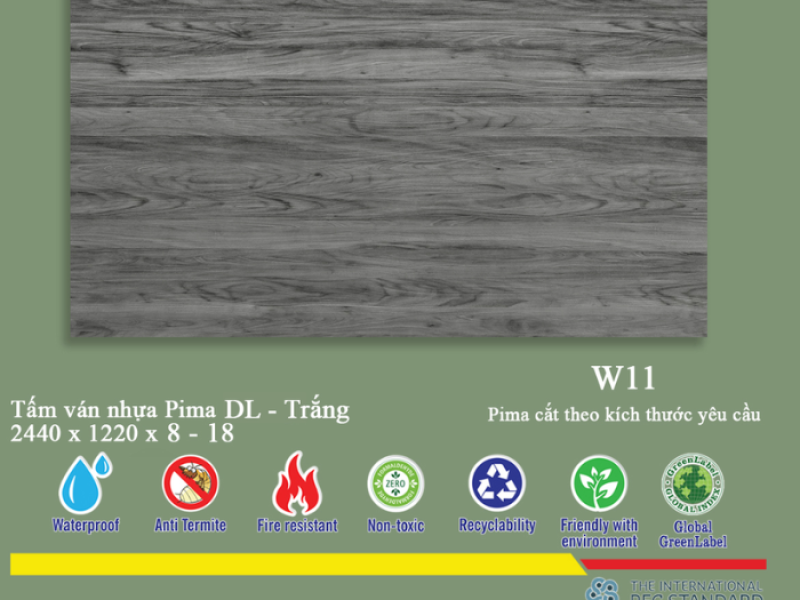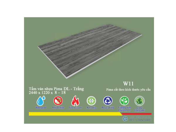 Sản phẩm được cấu tạo từ vật liệu Pima cao cấp, nổi tiếng với khả năng chống nước, chống ẩm, chống mối mọt và chịu lực tốt hơn nhiều so với gỗ tự nhiên truyền thống. Lớp phủ vân gỗ W11 được áp dụng cho cả hai mặt, mang đến vẻ đẹp hài hòa, đồng nhất cho sản phẩm. Lớp phủ này không chỉ có tính thẩm mỹ cao mà còn có khả năng chống trầy xước, chống bám bẩn, giúp bề mặt luôn sáng bóng và dễ dàng vệ sinh. Việc phủ hai mặt còn tăng cường khả năng chống cong vênh, nứt nẻ, đảm bảo độ bền bỉ theo thời gian.