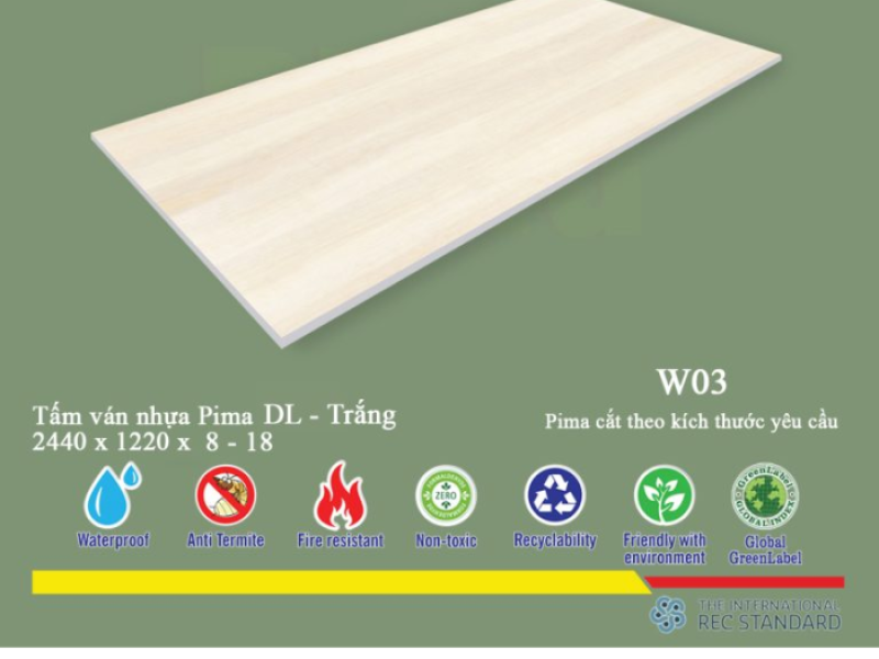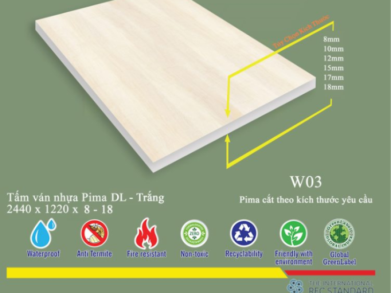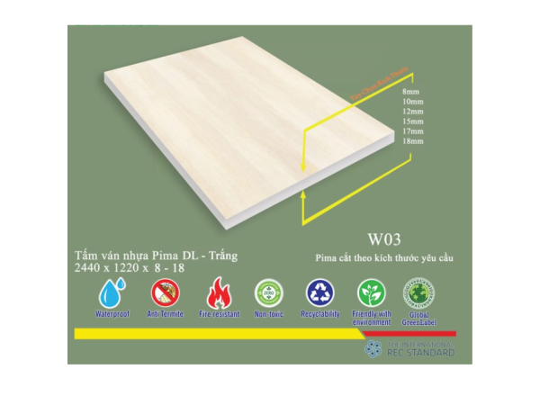 * Lưu ý: Tấm Pima DL 8mm phủ vân gỗ W03 - 1 mặt có lớp phủ ở một mặt, mặt còn lại thường có thể là mặt phẳng hoặc có lớp phủ mỏng hơn tùy theo yêu cầu sản xuất. Điều này cần được cân nhắc khi thiết kế để tối ưu hóa thẩm mỹ và chi phí.