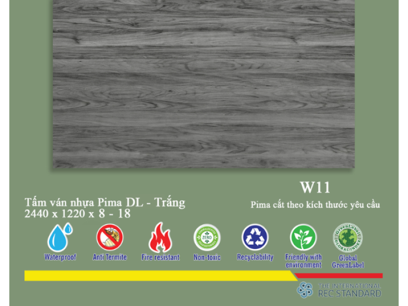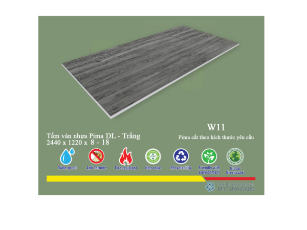 Lớp phủ vân gỗ W11 mang lại vẻ đẹp sàn gỗ tự nhiên, trong khi cấu trúc composite đảm bảo độ bền, chống trầy xước, chống ẩm và dễ dàng vệ sinh, đặc biệt phù hợp cho các không gian như phòng khách, phòng ngủ, văn phòng. Việc sử dụng TẤM VÁN NHỰA Pima DL cho sàn nhà là một lựa chọn thông minh, thay thế cho các loại sàn gỗ công nghiệp dễ bị hư hại bởi độ ẩm.