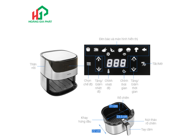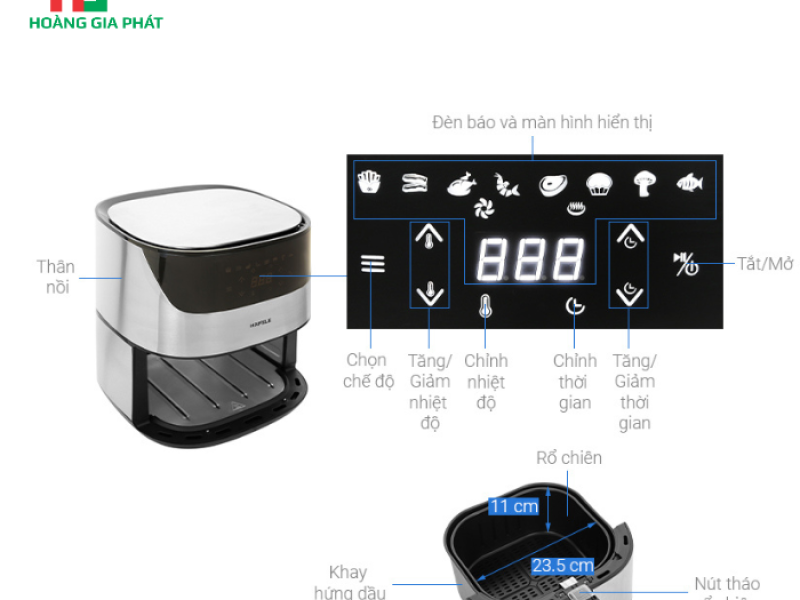 Sản phẩm này không chỉ đáp ứng nhu cầu nấu nướng lành mạnh mà còn nâng tầm không gian bếp của quý vị với vẻ ngoài đẳng cấp. Hafele 535.43.712 hứa hẹn mang đến những bữa ăn dinh dưỡng, giảm thiểu lượng dầu mỡ, góp phần bảo vệ sức khỏe cho cả gia đình. Hãy cùng Công Ty TNHH XNK TM Hoàng Gia Phát khám phá chi tiết về chiếc nồi chiên không dầu đặc biệt này.