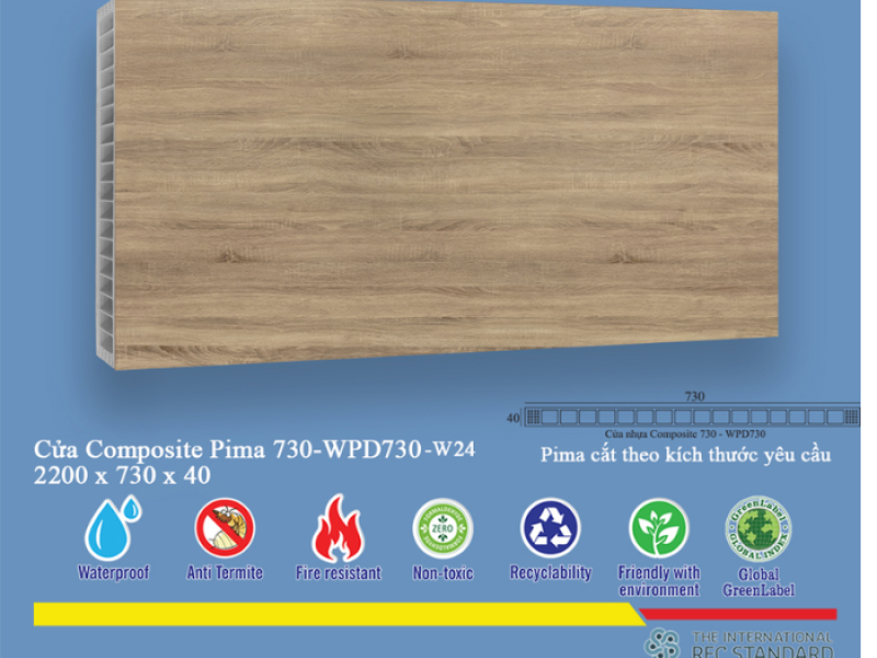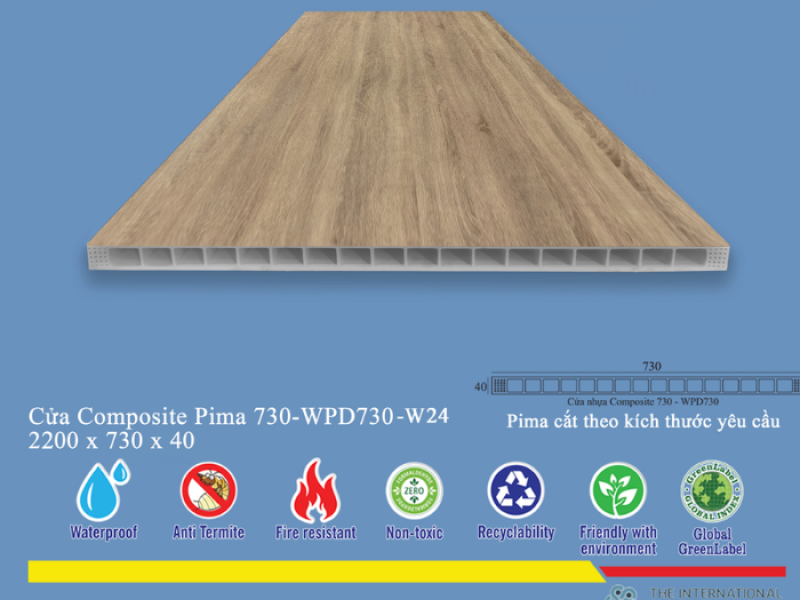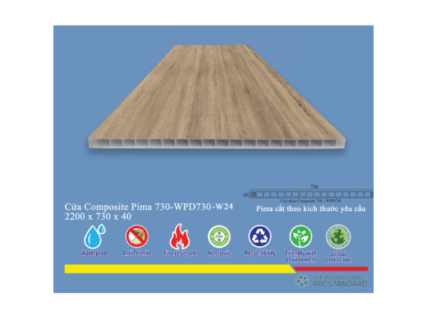 Phôi cửa Pima 73022 được chế tạo từ các loại nhựa cao cấp, có độ bền cơ học cao, chịu được tác động của môi trường và thời tiết. Quá trình sản xuất áp dụng công nghệ ép đùn tiên tiến, đảm bảo cấu trúc phôi đồng nhất, không bị nứt, cong vênh hay biến dạng theo thời gian. Lớp phủ vân gỗ W24 được áp dụng bằng kỹ thuật in ấn hoặc dán nhiệt tiên tiến, tạo ra bề mặt có độ chân thực cao, chống trầy xước, chống ẩm mốc và dễ dàng vệ sinh.