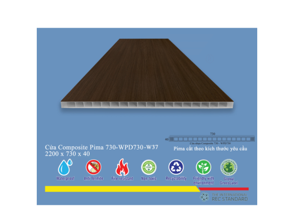 Phôi cửa Pima 73022 được sản xuất từ vật liệu composite cao cấp, một sự kết hợp hài hòa giữa nhựa PVC, bột gỗ và các phụ gia đặc biệt. Cấu trúc này mang lại cho sản phẩm độ cứng cáp, khả năng chống mối mọt, ẩm mốc và chịu lực tốt hơn nhiều so với gỗ tự nhiên hay các loại vật liệu truyền thống khác. Bề mặt phôi cửa được phủ một lớp vân gỗ W37, mô phỏng chân thực vân gỗ tự nhiên với độ nét cao, mang đến cảm giác ấm cúng, sang trọng và gần gũi với thiên nhiên.