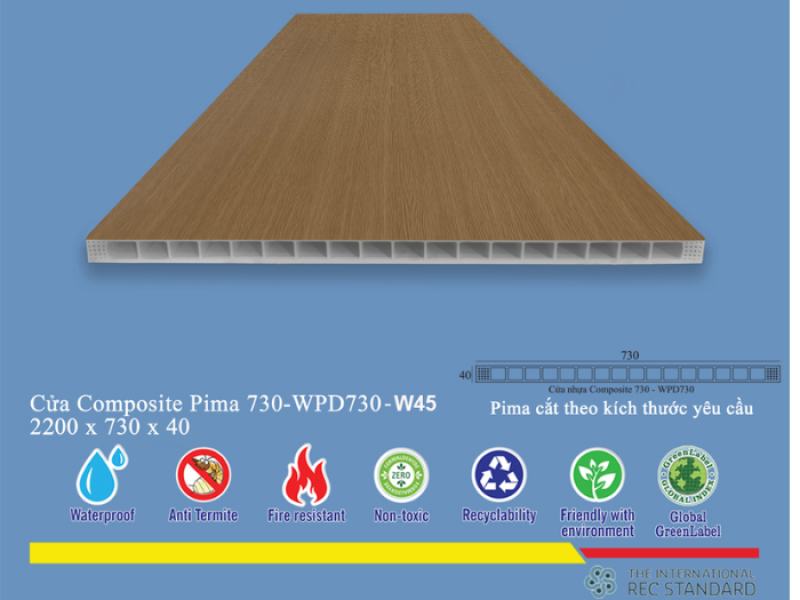Khả năng chống ẩm vượt trội của vật liệu giúp Phôi Cửa Pima 73022 trở thành lựa chọn lý tưởng cho các khu vực có độ ẩm cao như nhà tắm, nhà vệ sinh. Sản phẩm không chỉ đảm bảo độ bền mà còn ngăn ngừa tình trạng ẩm mốc, mối mọt, giữ cho không gian luôn sạch sẽ và thoáng đãng.