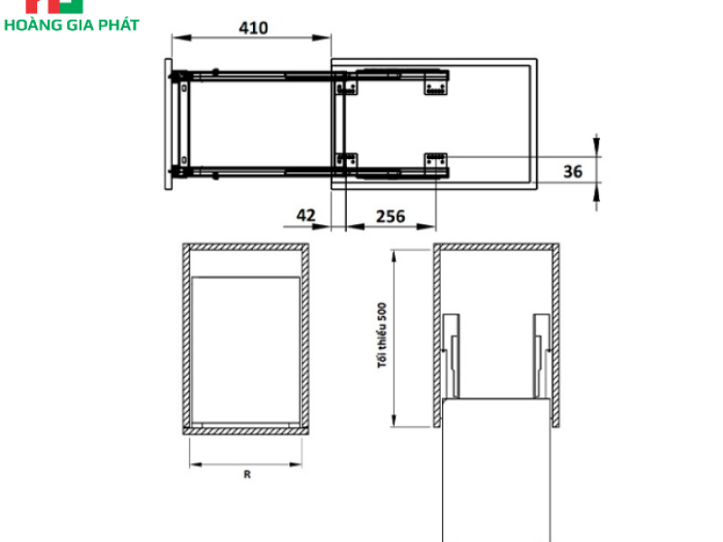 * Chiều rộng lọt lòng (R) yêu cầu: Tối thiểu 262mm - 268mm. Kích thước này đảm bảo rổ gia vị có thể trượt ra vào một cách thoải mái bên trong khoang tủ.