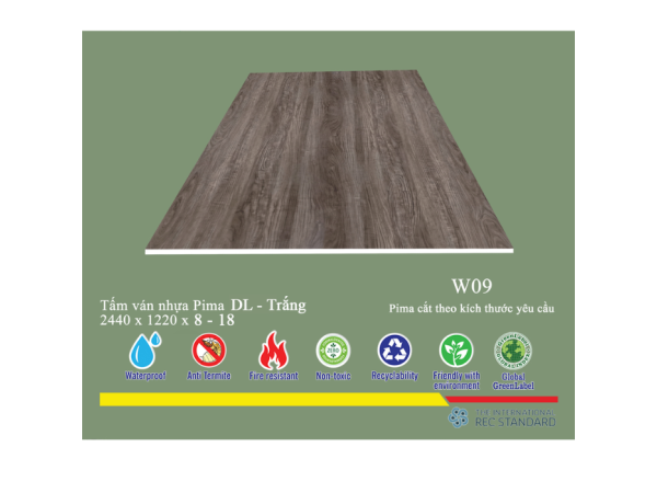 Điểm nhấn thẩm mỹ của sản phẩm nằm ở lớp phủ vân gỗ W09. Vân gỗ được mô phỏng chân thực, tinh tế với gam màu ấm áp, tạo cảm giác sang trọng, gần gũi và thân thiện với môi trường. Lớp phủ này không chỉ mang lại giá trị thị giác cao mà còn được tăng cường với lớp PE (Polyethylene) – một loại nhựa có độ bền cơ học tốt, khả năng chống trầy xước, chống hóa chất và dễ dàng lau chùi. Lớp PE giúp bảo vệ bề mặt gỗ khỏi các tác động từ môi trường bên ngoài, giữ cho sản phẩm luôn bền màu và đẹp mắt theo thời gian. Đặc biệt, việc có lớp phủ hai mặt giúp đảm bảo tính thẩm mỹ đồng đều và tăng cường khả năng bảo vệ cho cả hai phía của tấm ván.