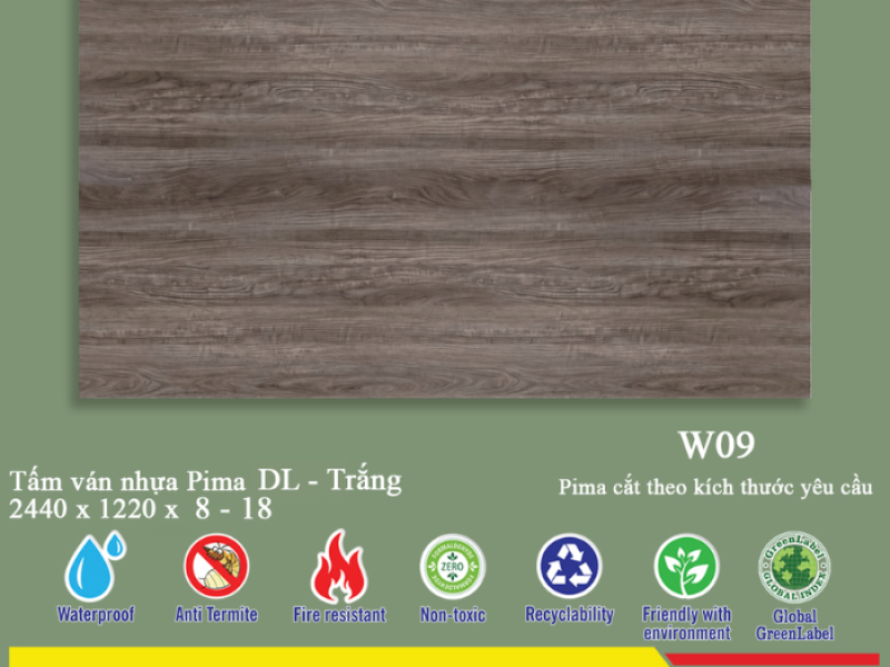 Tấm Pima DL 17mm phủ vân gỗ W09 (PE) - 2 mặt sở hữu những thông số kỹ thuật ấn tượng, đảm bảo hiệu suất hoạt động cao và độ bền lâu dài trong các ứng dụng nội thất.