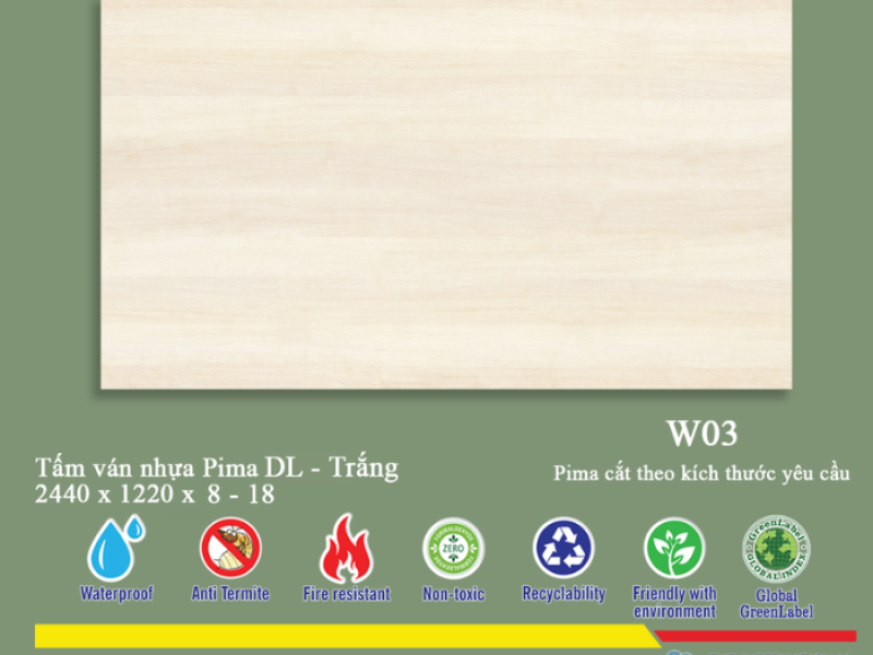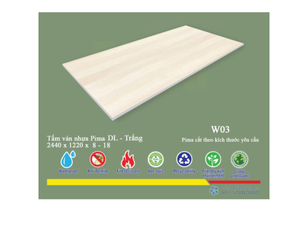 * Lưu ý: Tấm Pima DL 8mm phủ vân gỗ W03 - 1 mặt có lớp phủ ở một mặt, mặt còn lại thường có thể là mặt phẳng hoặc có lớp phủ mỏng hơn tùy theo yêu cầu sản xuất. Điều này cần được cân nhắc khi thiết kế để tối ưu hóa thẩm mỹ và chi phí.