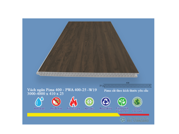 Sản phẩm được chế tạo từ vật liệu composite cao cấp, đảm bảo độ bền, khả năng chống chịu tốt với các tác động từ môi trường. Lớp phủ vân gỗ W19 được ứng dụng công nghệ hiện đại, tạo ra bề mặt có độ chân thực cao về màu sắc, vân gỗ và cả cảm giác chạm. Cấu tạo mỏng nhẹ nhưng chắc chắn, với độ dày 2,5 cm, rất phù hợp cho nhiều ứng dụng khác nhau trong thiết kế nội thất.