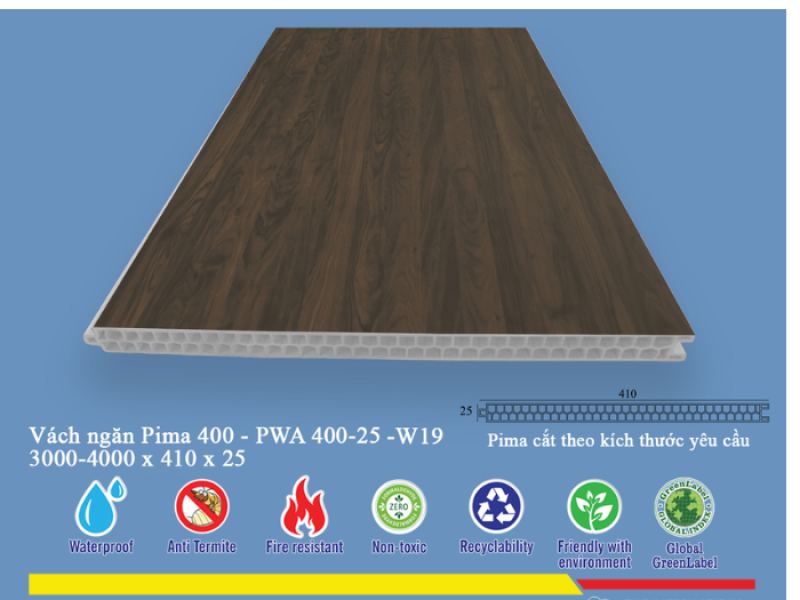 Được làm từ vật liệu composite, tấm vách ngăn Pima 40025 sở hữu độ bền cao, khả năng chống ẩm, chống mối mọt, chống cháy lan tốt hơn so với gỗ tự nhiên. Điều này làm cho sản phẩm trở nên lý tưởng cho các khu vực có độ ẩm cao như nhà bếp, phòng tắm, hoặc các không gian cần đảm bảo an toàn phòng cháy chữa cháy. Khả năng chống trầy xước và dễ dàng vệ sinh cũng là những điểm cộng lớn, giúp sản phẩm giữ được vẻ đẹp bền lâu theo thời gian.